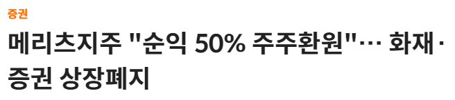 이와 더불어 합병이후 메리츠 금융 지주는 연결 순이익의 50%를 주주에게 환원하겠다고 발표하였다.