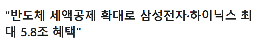 첫째는 반도체 등의 투자 세액 공제 발표이다. 정부는 중국, 일본, EU, 미국 등 주요 선진국이 반도체 공장 유치에 사활을 걸고 있는 만큼 한국에 투자하는 기업에도 비슷한 수준의 인센티브를 줘야 한다는 입장이다. 특히 올해 투자할 경우 추가로 10%를 더 공제 해주는 등 파격적인 지원책을 내놨다. 시장의 기대를 넘는 수준으로 관련 대기업 및 중소기업 실적에 큰 힘이 될 전망이다. SK하이닉스가 단기간에 급등한 것도 이것이 가장 큰 이유다.