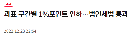 둘째는 법인세 조정이다. 지난 문재인 정부는 2017년 22%이던 법인세를 25%로 상향 조정하였다. 5년만에 다시 법인세를 24%로 인하한 것이다. 1%가 큰 것 같지는 않지만 주식시장 입장에서는 작은 호재라도 생기는 것이 중요하다. 법인세가 줄면 순이익이 늘어나는 효과가 있기 때문에 주주 입장에서는 나쁠 것이 없다. 적다고 무시할만한 뉴스가 아니다.