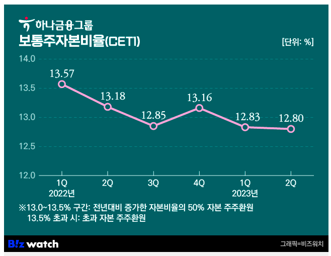 하나금융지주의 주주환원 기준은 비교적 명확하다. 보통주 자본비율이 13%를 초과하면 초과한 자본의 50%를 추가로 주주들에게 환원하겠다는 것이다. 상반기 현재 12.8%로 13% 미만이라 자사주 매입을 실시하지 않은 것으로 보인다.