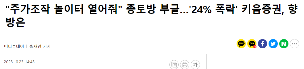 나는 먼저 주주환원 발표와 영풍제지 미수금 사건의 시간차가 크지 않은 것에서 가장 큰 의문을 가지고 있다. 딱 10일 차이다. 과연 키움증권이 이번 사태를 전혀 몰랐던건지 궁금하다. 만약 어떤 식으로든 인지한 상태에서 주가를 먼저 띄우기 위해 주주환원을 발표하고 10일 뒤 악재를 발표했다면 이것은 범죄행위다.