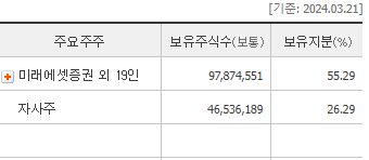 이 기업의 대주주는 미래에셋증권으로 약 22%의 지분을 보유하고 있다. 다음으로는 미래에셋 캐피탈과 미래에셋자산운용이 2,3대 주주로 올라있다. 흥미로운 지점은 계열사 보유지분과 자사주를 포함하면 약 81.58%에 육박한다는 점이다. 전체 발행 주식수의 약 18.42%만이 유통 주식이다. PBR역시 0.2배 수준으로 매우 저평가 되어있다. 배당이나 자사주 매입과 같은 주주환원이 2년째 이루어지고 있지 않아 주가가 극도의 저평가에 머물러 있다.