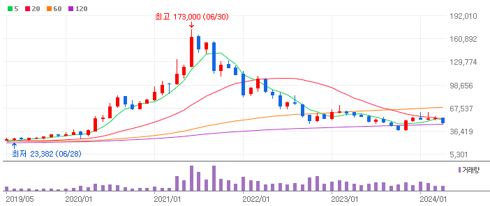 기술적으로 보면 거의 바닥 근처에 와 있는 것으로 보이나 한국 주식시장이 5~10월에 약세를 보인다는 점에서 아직 한번의 추가 하락이 남아 있는 것으로 보인다. 개인적으로 4만원 이하에서는 진입이 나쁘지 않은 것처럼 보이지만 주식시장 전체의 약세를 극복하기는 어렵다는 점에서 전저점을 다시 테스트할 가능성도 있다. 따라서 4만원 이하에서는 3만원까지 분할로 10월까지 목표 수량을 모아간다면 11월에서 내년까지 이어질 성장주 랠리에서 좋은 수익을 줄 것으로 생각된다.