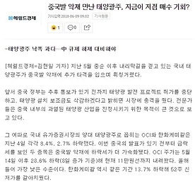 에너지 썸네일형 리스트형 30. 태양광 업종에 대한 투자매력도? 중국발 태양광 발전 수요감소 우려, 하지만 장기적으로 투자 유망 최근 중국의 태양광 산업에 대한 규제 우려로 한국 시장내 OCI와 한화케미칼의 주가가 곤두박질 치고 있다. 그도 그럴것이 중국은 전세계 태양광 발전시장 1위 국가이기 때문에 태양광 업체의 주가는 중국 정부의 정책에 민감할 수 밖에 없다. 하지만 최근의 주가 하락은 좀 과도해 보인다. 특히 한화케미칼의 경우 전체 영업이익에서 태양광이 차지하는 비중이 미미하다. 오히려 주력제품인 가성소다 등의 가격은 강세를 기록하고 있고 올해 예상이익기준 PER이 4.5배에 불과해 투자매력이 매우 높다. 또한 태양광시장은 향후에 커질수 밖에 없는 시장이다. 4차 산업혁명은 인공지능과 로봇 그리고 클라우드 등 많은 전력을 요구하기 때문에 에너지원의 안정적인 공급.. 더보기 21. 키움증권 하반기 주식시장 전망 소개 하반기 주식시장 긍정적, 중국관련 소비재 주목 금일 키움증권에서 나온 하반기 주식시장 전망에 관한 서머리를 소개하고자 한다. 기본적인 뷰는 하반기에는 주식시장이 상승할 가능성이 높다는 측면과 내수업종 중심으로 관심이 필요하다는 글이다. 최근 중국인 관광객이 다시 늘어나기 시작하면서 관광, 면세, 화장품, 항공 관련 주식이 오르고 있는데 이런 트렌드가 하반기까지 이어질 가능성이 높다는 뜻이다. 한번씩 읽어보면 도움이 될 듯 하다. 더보기 이전 1 다음